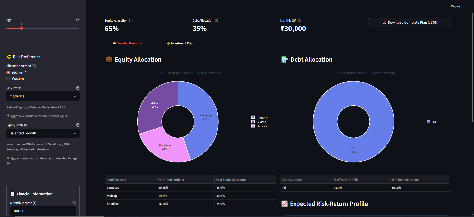 The app generates an optimized asset allocation strategy across different fund categories (large-cap, mid-cap, small-cap, debt, etc.) based on user inputs (age, income, risk tolerance, investment goals, etc.)
