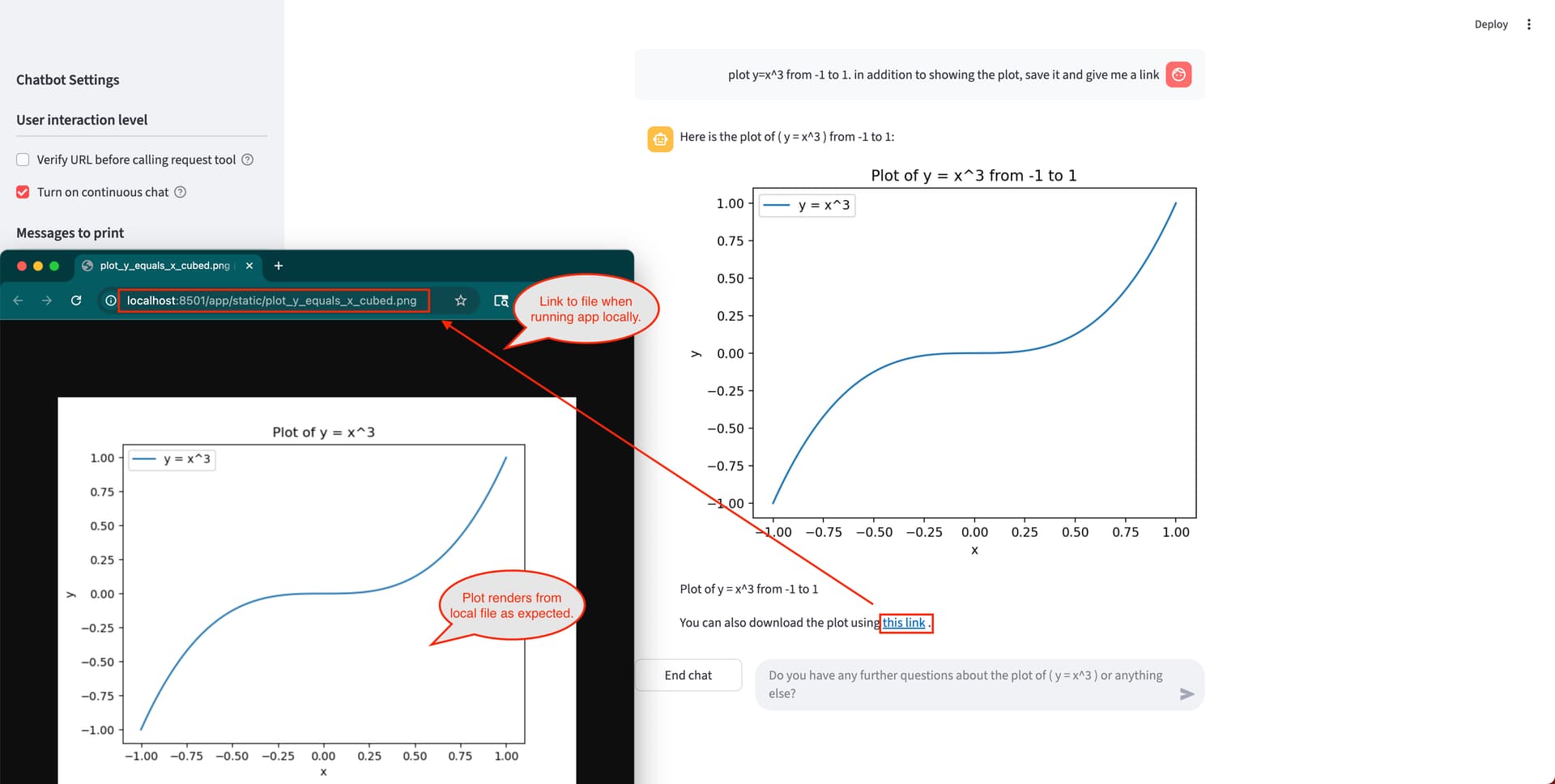I have been able to use static file hosting (Static file serving - Streamlit Docs) to create plots, put them in the ‘static’ folder, and then render the image directly from the file using ! [caption] (app/static/file.ext) or give a link where the file could be loaded in a new tab using the [caption] (app/static/file.ext) approach; I have put some extra spaces in this example so the markdown does not render here. This works locally on my computer, creating a link like localhost:8501/app/static/file.ext or showing the file directly in the message stream (not in screenshot).