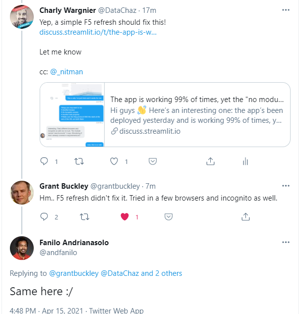 Here’s an interesting one: the app’s been deployed yesterday and is working 99% of times, yet the “no module named” error is being reported by some users.
